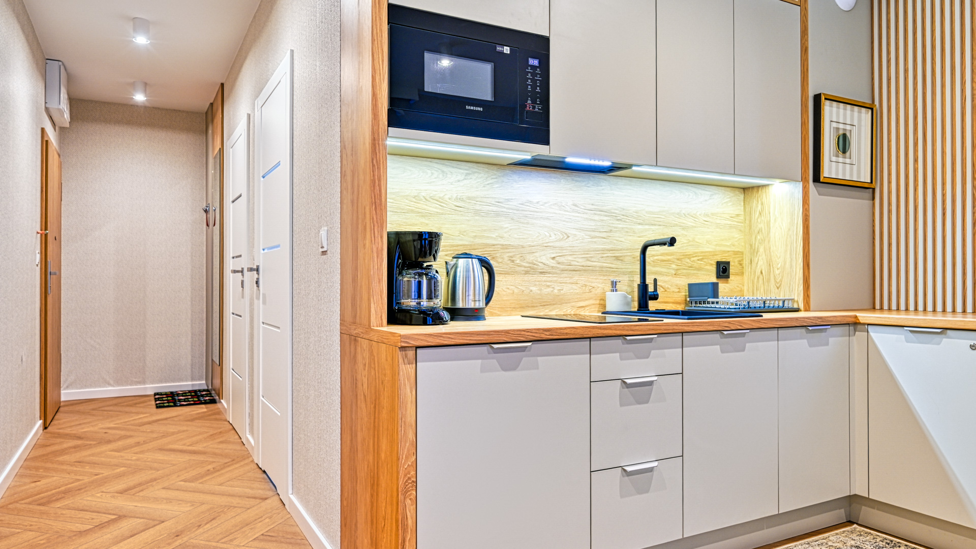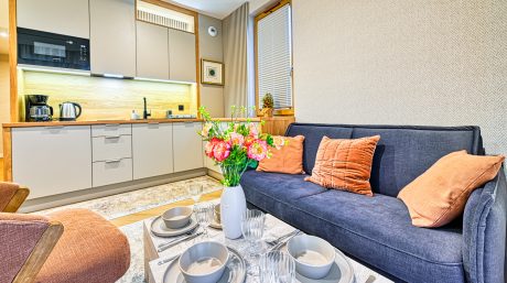 Apartament składa się z sypialni z wygodnym łóżkiem podwójnym, salonu z rozkładaną sofą dwuosobową, w pełni wyposażonego aneksu kuchennego oraz eleganckiej łazienki z prysznicem. Wnętrze urządzone zostało w nowoczesnym stylu, z dbałością o każdy detal, aby zapewnić Gościom najwyższy komfort pobytu.