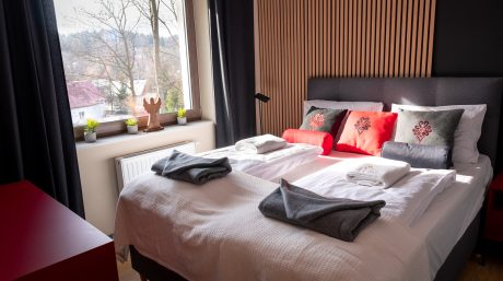 Prezentowany apartament jest częścią prestiżowego kompleksu Stone Hill w samym centrum Szklarskiej Poręby. To nowoczesny, w pełni wyposażony apartament o powierzchni 38m^2, przeznaczony dla maksymalnie czterech osób. Składa się z sypialni, w której stoi duże, małżeńskie łoże, części wypoczynkowej, połączonej z aneksem kuchennym oraz łazienki z prysznicem i pralką. W części dziennej stoi rozkładana, dwuosobowa sofa, naprzeciwko której wisi panoramiczny telewizor.