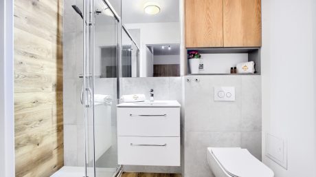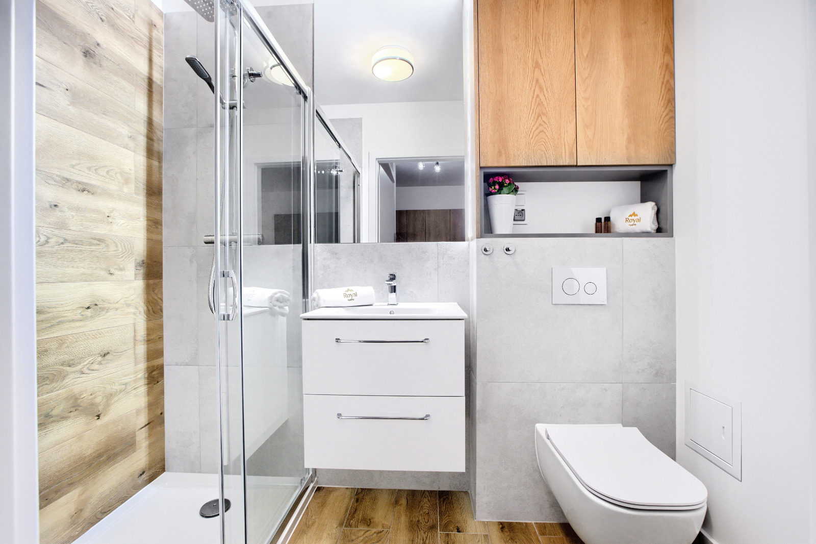 Nowoczesna łazienka jest wyposażona w przestronny prysznic, umywalkę i toaletę. Jasne wnętrze oraz eleganckie wykończenie zapewnią komfort i wygodę, a dodatkowe akcesoria, takie jak suszarka do włosów, pozwolą na pełen relaks.