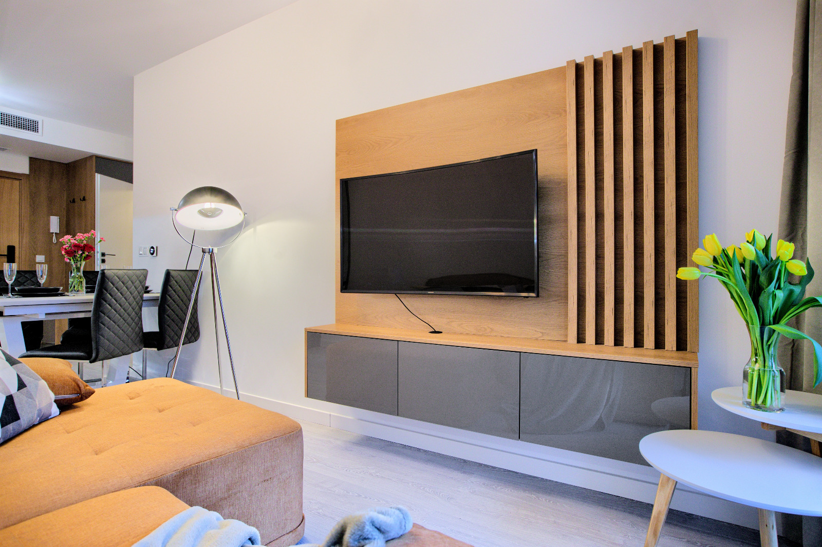 W przytulnym salonie znajdziesz wygodną sofę, która doskonale sprawdzi się jako miejsce do relaksu po dniu pełnym wrażeń. Telewizor z płaskim ekranem oraz dostęp do klimatyzacji zapewnią rozrywkę i komfort niezależnie od pory roku. Z salonu płynnie przejdziesz do funkcjonalnego aneksu kuchennego, wyposażonego we wszystkie niezbędne urządzenia i przybory kuchenne, umożliwiające przygotowanie pysznych posiłków.