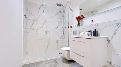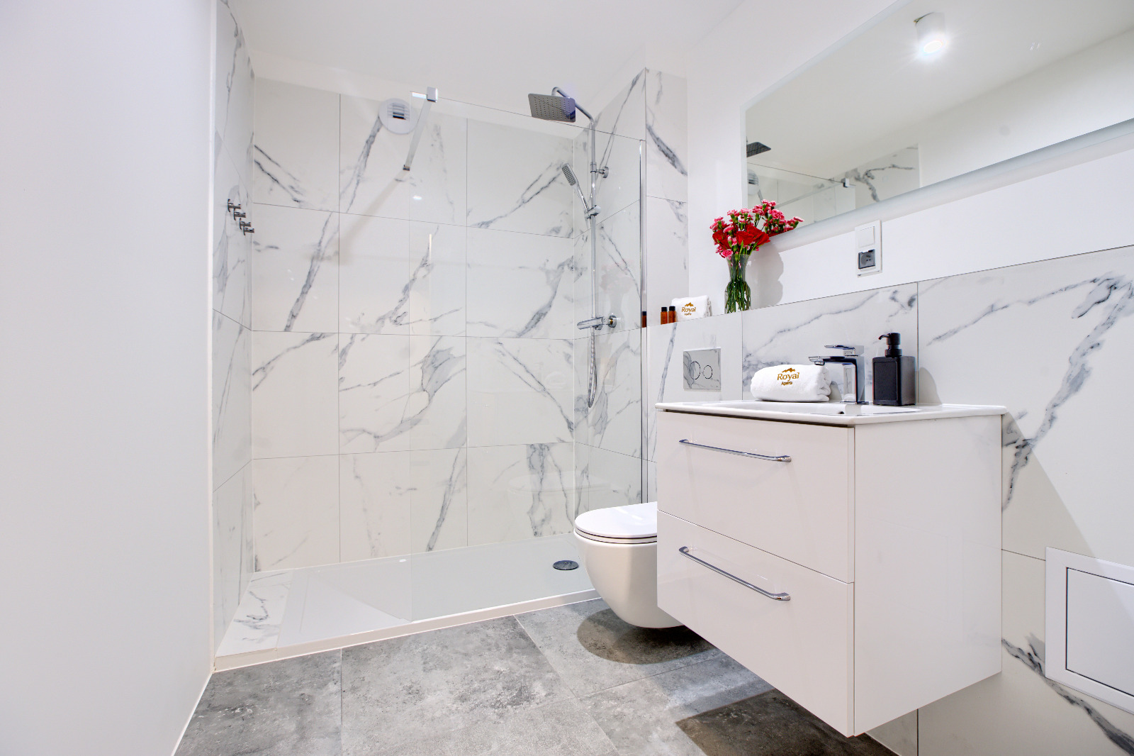 Nowoczesna łazienka jest wyposażona w przestronny prysznic, umywalkę i toaletę. Jasne wnętrze oraz eleganckie wykończenie zapewnią komfort i wygodę, a dodatkowe akcesoria, takie jak suszarka do włosów, pozwolą na pełen relaks.