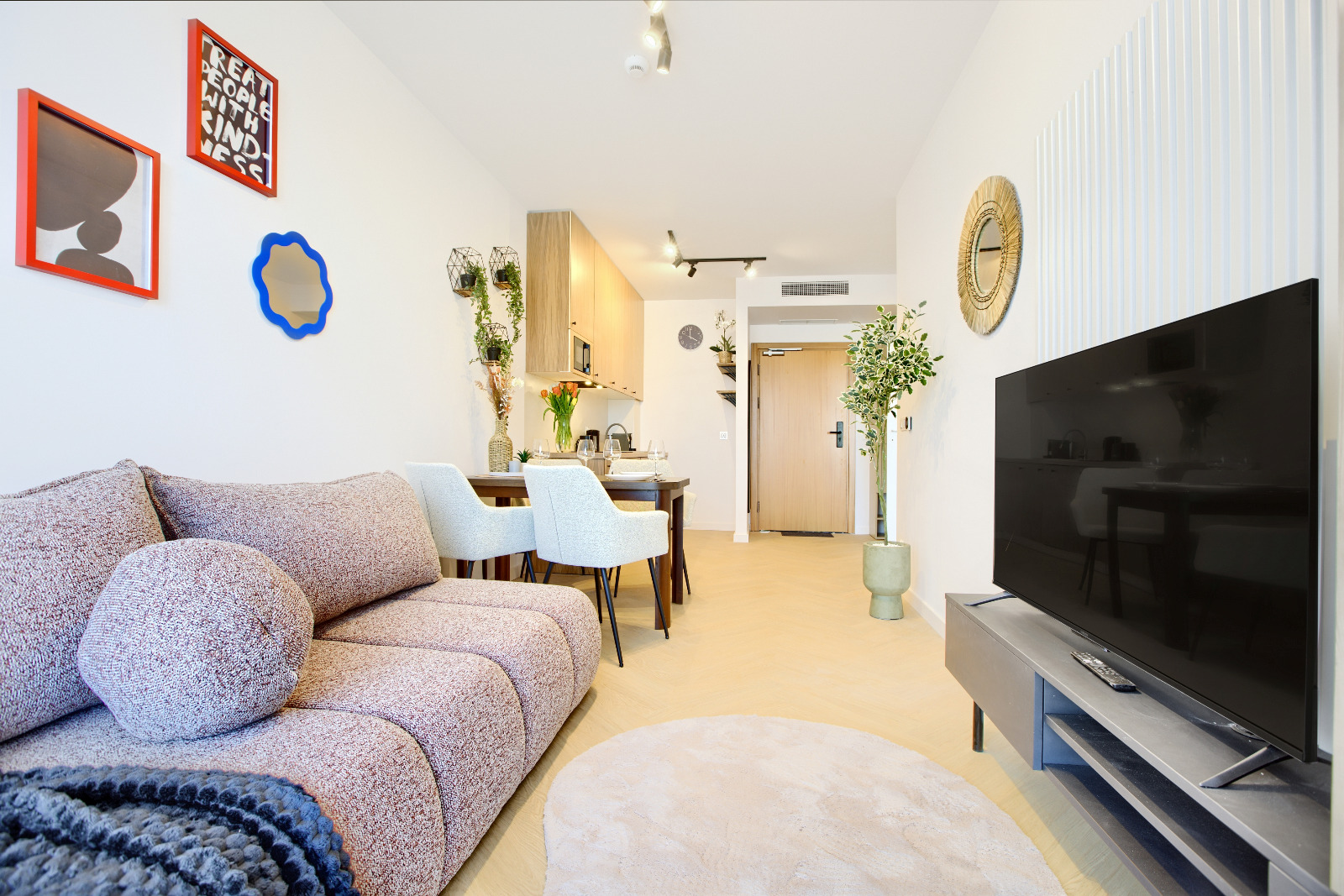 W przytulnym salonie znajdziesz wygodną sofę, która doskonale sprawdzi się jako miejsce do relaksu po dniu pełnym wrażeń. Telewizor z płaskim ekranem oraz dostęp do klimatyzacji zapewnią rozrywkę i komfort niezależnie od pory roku. Z salonu płynnie przejdziesz do funkcjonalnego aneksu kuchennego, wyposażonego we wszystkie niezbędne urządzenia i przybory kuchenne, umożliwiające przygotowanie pysznych posiłków.