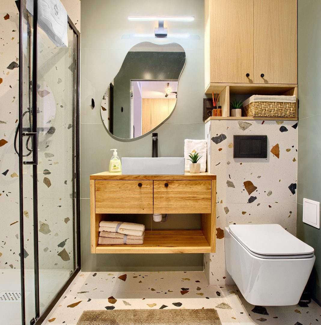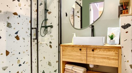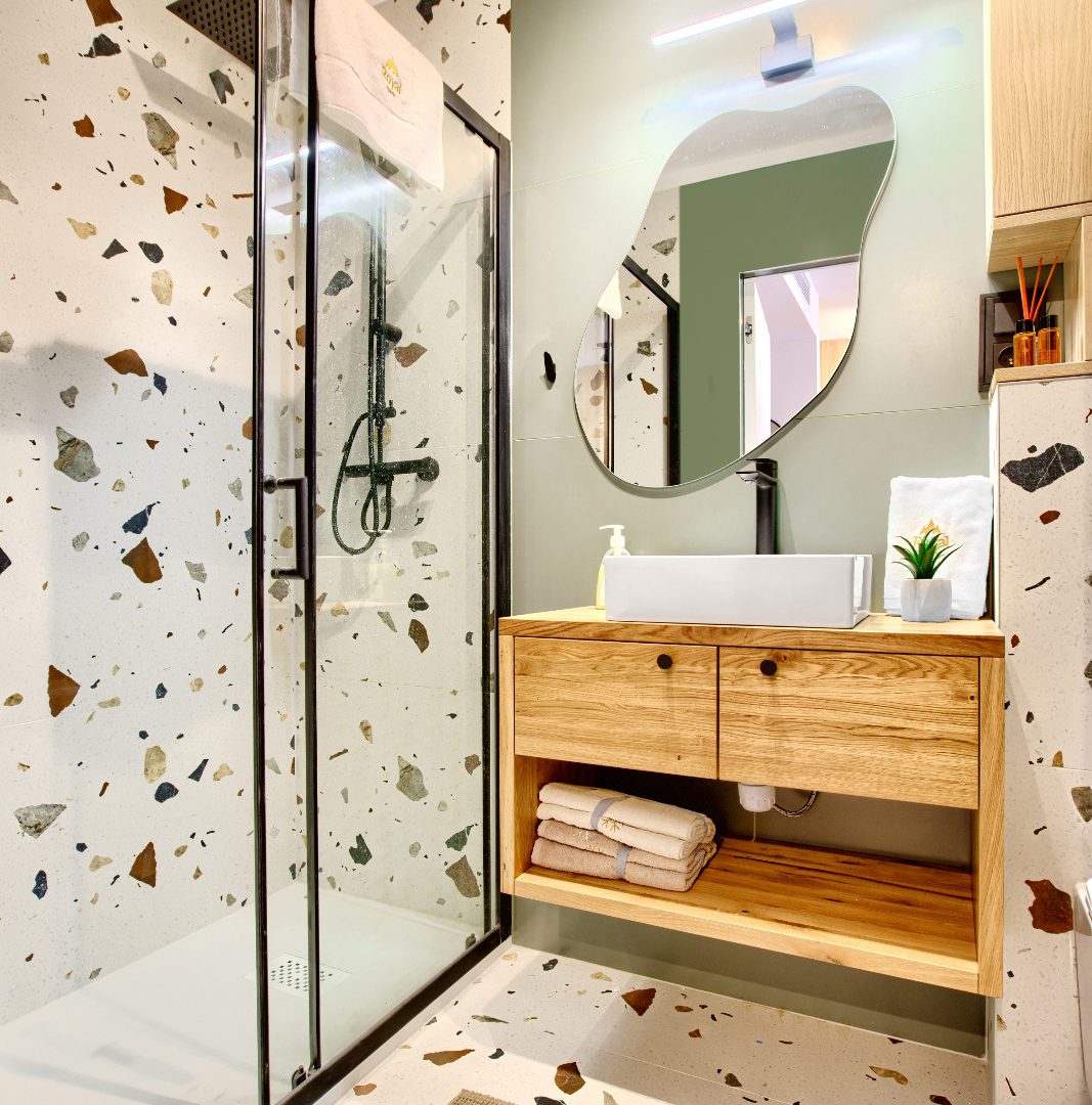 Nowoczesna łazienka jest wyposażona w przestronny prysznic, umywalkę i toaletę. Jasne wnętrze oraz eleganckie wykończenie zapewnią komfort i wygodę, a dodatkowe akcesoria, takie jak suszarka do włosów, pozwolą na pełen relaks.