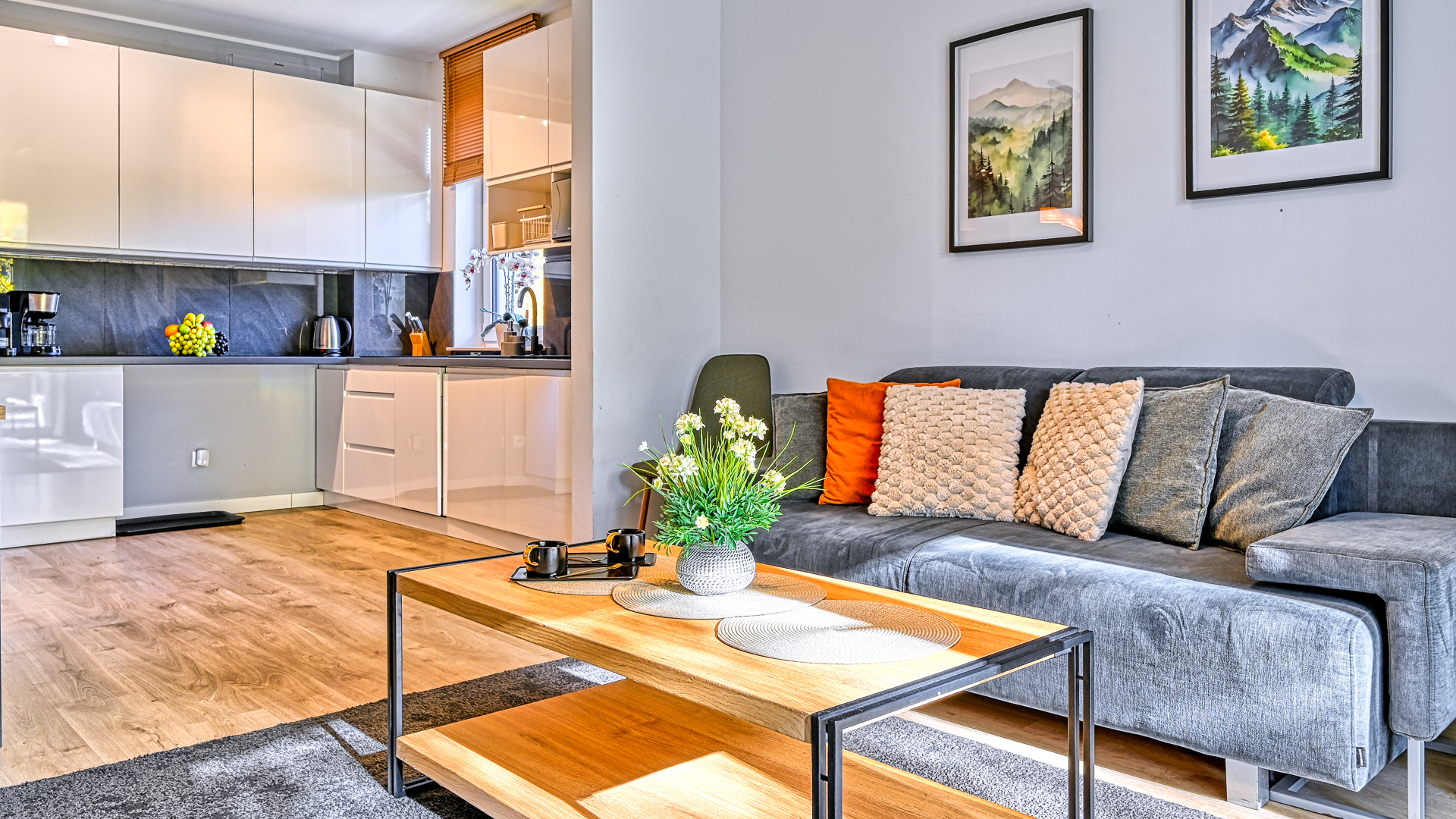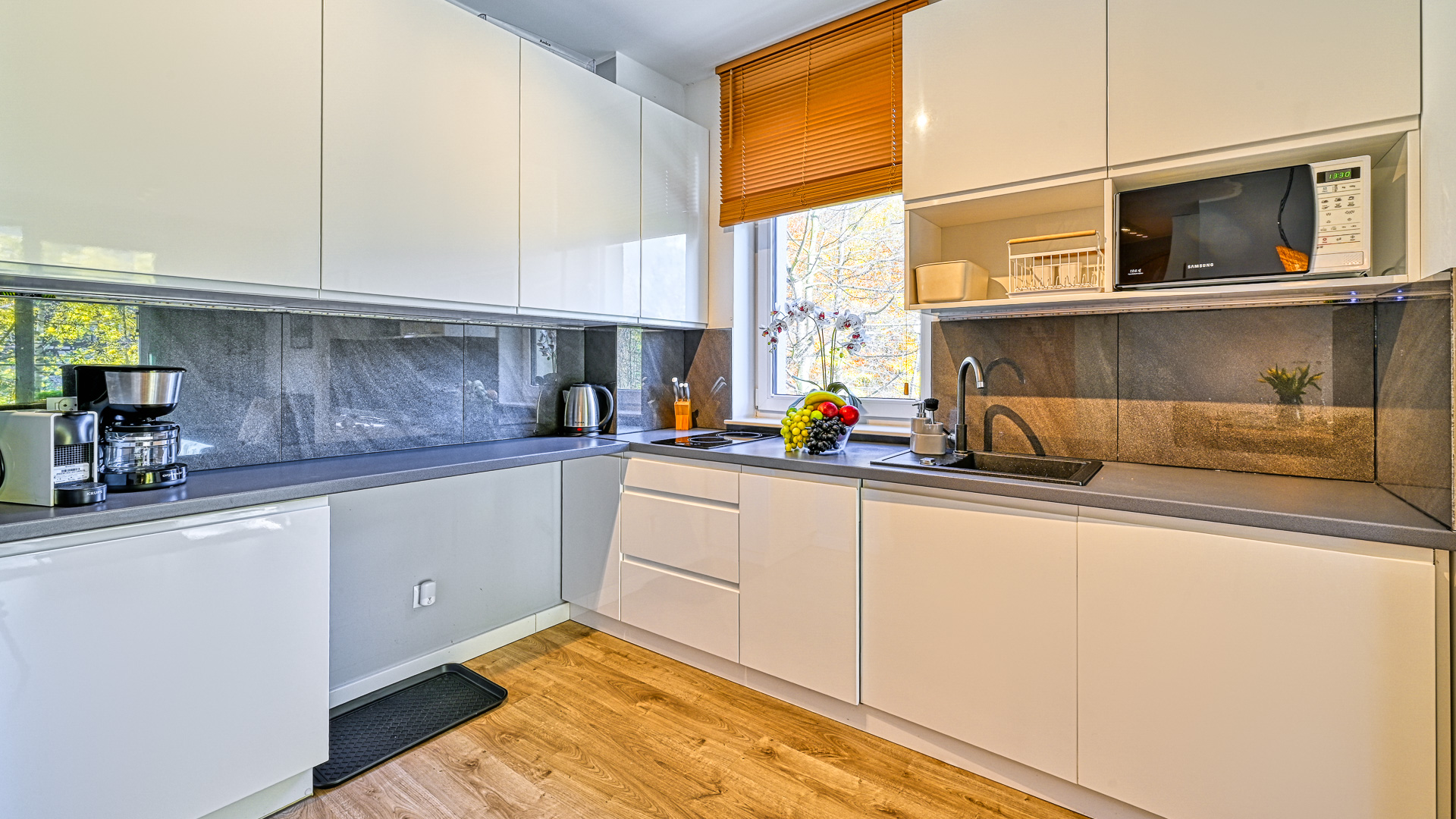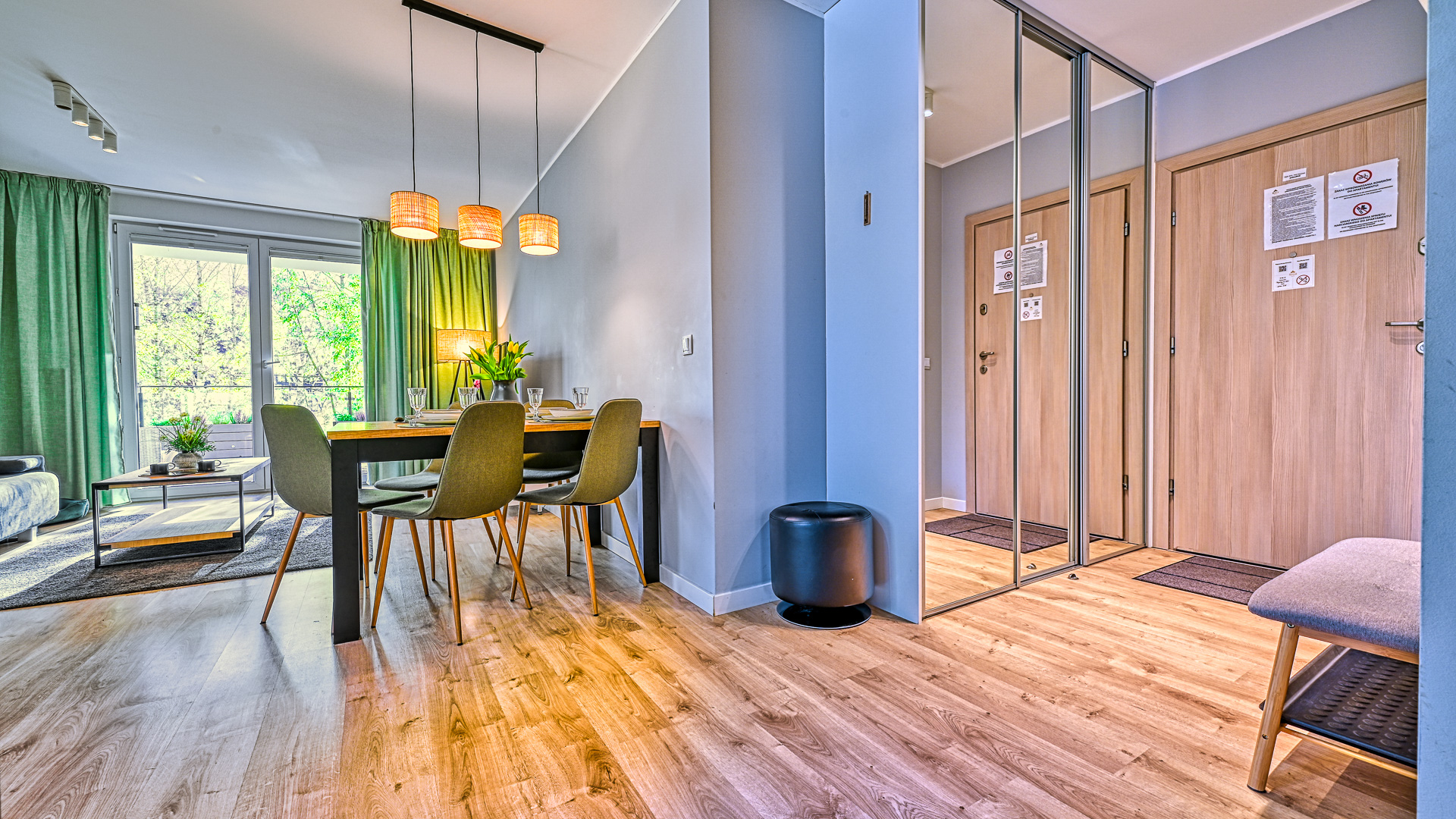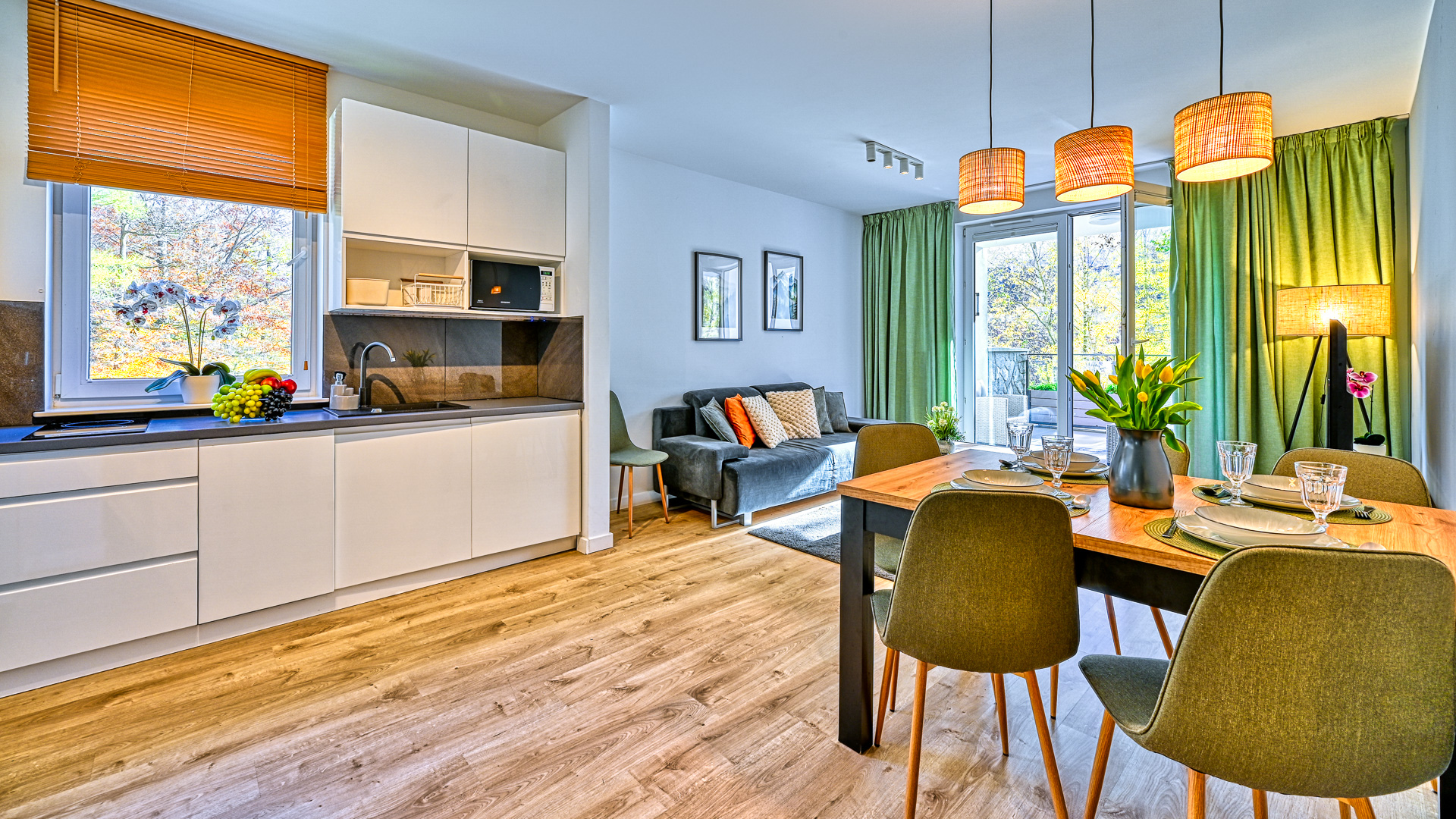 Duży, rodzinny apartament z trzema pokojami. Posiada dwie oddzielne sypialnie z szafami na ubrania, łazienkę z przestronnym prysznicem oraz klimatyczny salon z rozkładaną pełnowymiarową sofą, stołem jadalnym wraz z w pełni wyposażonym aneksem kuchennym z ekspresem przelewowym. Przed samym wejściem do budynku czeka na naszych gości prywatne miejsce parkingowe. Panoramiczny telewizor zapewni naszym gościom wspaniałą rozrywkę przy wieczornych seansach. Na balkonie czeka stolik kawowy i czyste powietrze. Do Państwa dyspozycji jest winda, miejsce parkingowe oraz ogólnodostępne pomieszczenie na sprzęt sportowy.
